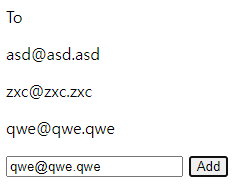 먼저 구현할 것은 ..writePage.toAdd() 메서드, 즉 받는 사람을 추가하는 메서드이다. input#to 개체의 값을 배열에 추가하고, 배열의 내용을 div.to-list 개체 내에 표시한다.