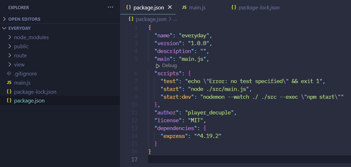 이번 프로젝트에서는 데이터베이스를 사용하지도 않고, 복잡할 것으로 예상되는 기능이 몇 없으므로 가볍지만 강력한 Node.js 프레임워크인 'Express.js'를 사용하고자 한다. 적절한 장소에 빈 디렉터리를 만든 후 npm을 통해 기본적인 package.json 파일을 작성하고, 빠른 디버깅을 위해 'nodemon'을 설정해 준다.