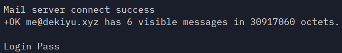 미리 설치해 두었던 'mailpop3'를 테스트해 본다. 아래 코드는 순서대로 클라이언트를 POP3 서버에 연결하고, 로그인을 요청하고, LIST 명령어를 전송하여 메일 리스트를 불러오며, 메일 리스트의 2번째 메일을 다운로드하여 데이터를 콘솔에 표시하게끔 작동한다.
