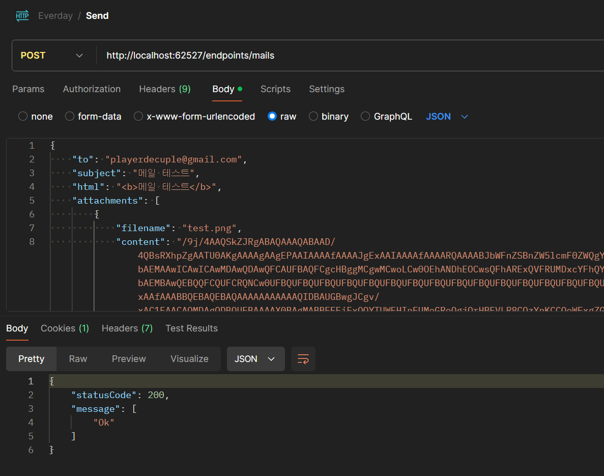 이메일의 내용 요소에는 첨부된 파일도 있다. urlencoded를 통해 파일을 업로드받는 방법이 있겠지만, POST 요청의 Body에 Base64 형식으로 받아도 크게 문제될 것이 없다. 따라서 최대한 코드를 변형하지 않고 필요한 코드를 맞추어 넣는다.