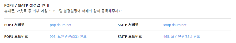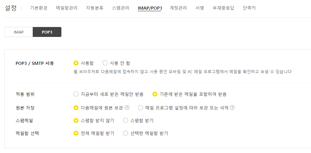 일단, 제일 중요한 기능인 메일의 송수신을 테스트할 생각이다. 따라서, 자체적으로 구축한 메일 서버가 아니라면 관련 설정에서 SMTP와 POP3을 활성화하여야 한다. 그리고, 현재 사용하는 메일 서버의 SMTP 서버 정보와 POP3 정보가 필요하다. 필자가 사용하기로 한 다음 스마트메일에서는 SMTP와 POP3를 활성화할 수 있는 메뉴에서 해당 정보들을 찾을 수 있었다.