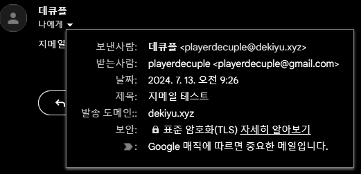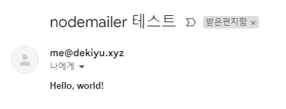 받는 이메일 주소를 가진 계정으로 다음 메일에 로그인하면, 다음과 같이 성공적으로 메일을 받았음을 확인해 볼 수 있다. Gmail과 같은 다른 메일 주소로도 스팸 메일로 분류되지 않고 잘 전송되는 모습을 확인할 수 있었다.