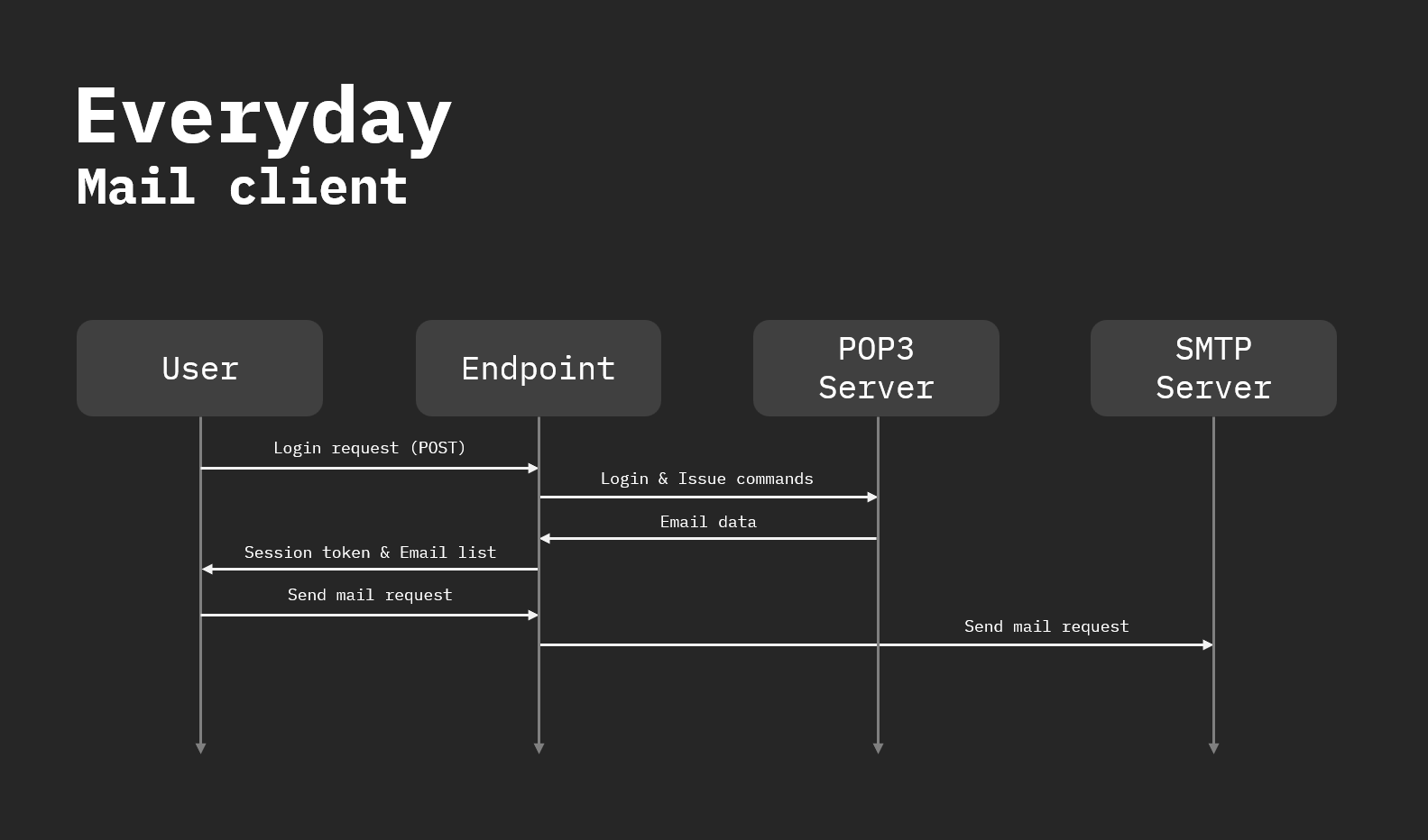 사용자가 엔드포인트에 로그인을 요청하면, 사용자가 입력한 이메일 주소와 비밀번호를 POP3 서버에 각각 USER, PASS 명령으로 보낸다. POP3 서버가 이에 대해 'OK' 응답을 한다면 사용자가 입력한 이메일 주소와 비밀번호가 로그인 성공한 것으로 간주되어 세션을 부여하고 사용자를 로그인 처리할 것이고, 그렇지 않는다면 사용자에게 Fallback 메시지를 표시할 것이다.