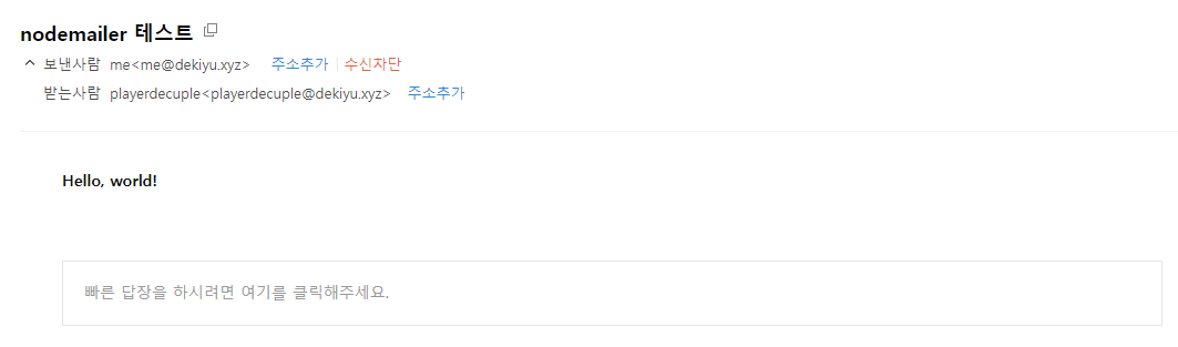 mailpop3는 잘 동작함을 확인했다. 리스트를 어떻게 보여주어야 하는가는 잘 생각해보아야 하겠지만, 아직은 테스트 단계이니 넘어가 보고 이번에는 SMTP 통신을 위해 nodemailer를 테스트해 본다. nodemailer는 이벤트 핸들러 기반으로 작성된 mailpop3에 비해 사용하기 상당히 쉽다. 연결하고 메일을 보내는 코드만 작성하면 된다.